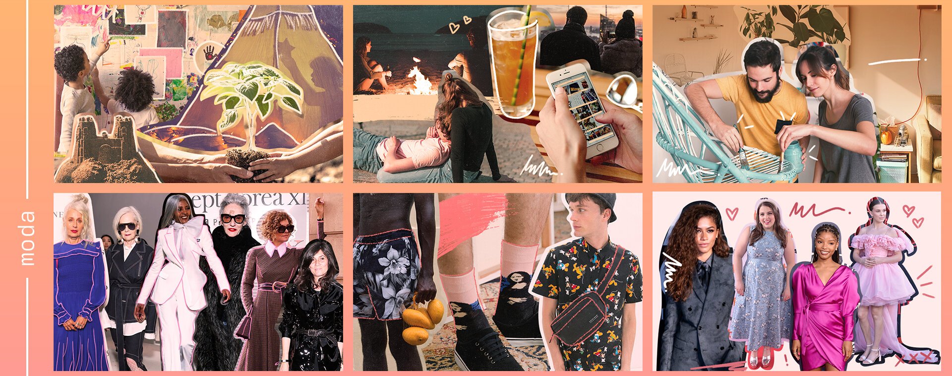 The posts were divided into four categories: entertainment, well-being, behavior and fashion. Each defined by a dominant color - blue, green, orange and pink. We brought he concept of a sketchbook with elements such as handmade doodles, paints and cutouts.